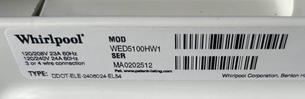 Electric Dryer Model WED5100HW1 Capacity 7.4 Cb Ft
