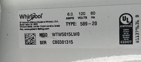Washer Model WTW5015 LW0 Capacity 4.5 Cb Ft