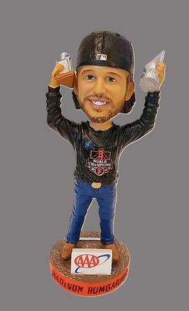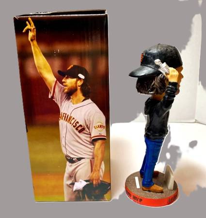 Celebrate the San Francisco Giants' 2014 World Series win with this vintage Madison Bumgarner MVP bobblehead. This rare piece of sports memorabilia features Bumgarner, the star pitcher of the championship team, in his iconic Giants uniform. Perfect for any baseball fan or collector, this bobblehead is a must-have addition to your collection. Highlighting the year, team, and player aspects, this bobblehead is a unique piece that captures the essence of the historic win. With its vintage charm and high-quality design, this item is sure to be a conversation starter and a beloved addition to any sports collection. Don't miss out on the chance to own this special piece of Giants history. Local Pickup in Modesto. Cash Only