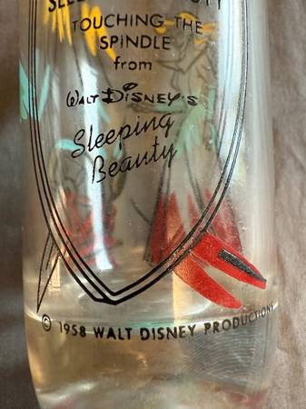 Collectible glass featuring Sleeping Beauty (Briar Rose) pricking her finger on the spinning wheel.