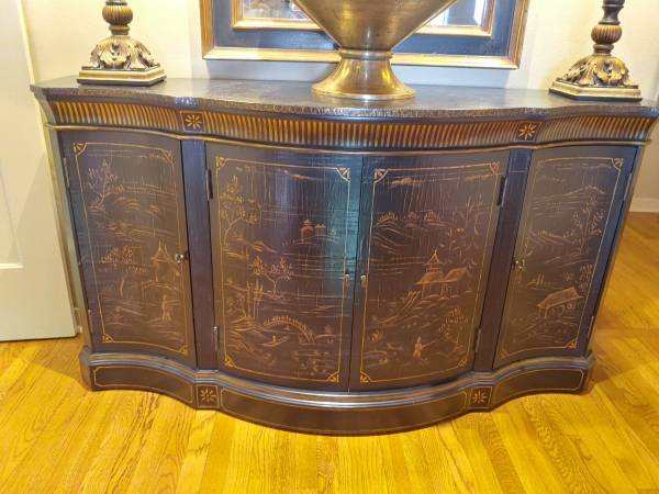 - Lacquered with gesso glaze, textured, gold-painted accents, and hand-painted traditional Chinese landscape designs