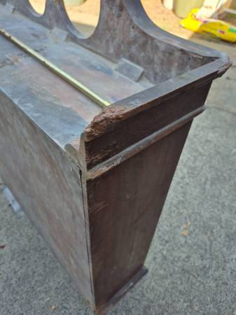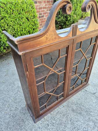 Antique China Cabinet, damage on decorative spire and at corners. veneer on bottom is falling off. Great for bar display!!