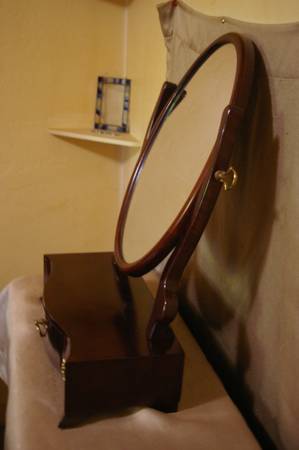 Free-standing English Regency style piece with total dimensions of 24” Tall 16 ½” Wide 8” deep. Base is 16 ½” Wide 8” deep 4 ½” tall. Oval, tilting mirror is 18” tall and 12 ½” wide. Single center drawer to store items. Features brass drawer pulls and mirror hinges. Fine condition (was in storage for 35 years) – very light usage, minor scratches scuffs; see photos.