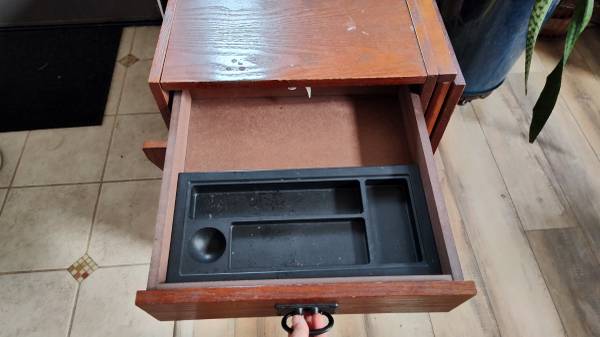 Top drawer is shallow drawer for office supplies. Bottom 2 drawers are filing cabinet height. Everything works but there are scuffs as it has been used for 20 years. Porch pickup in north Modesto...