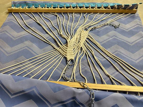 Comes with attached chains and hooks for hanging. Zippered mosquito net (seen in bag) thrown in extra.