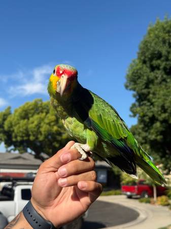 7 month old red lored available with a rehoming fee tamed for questions email me with your contact info