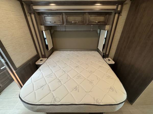 Enjoy the privacy of a rear master suite with a king-size bed, wardrobe storage, and an en-suite full bath. A half bath mid-coach is perfect for guests or quick use while traveling.