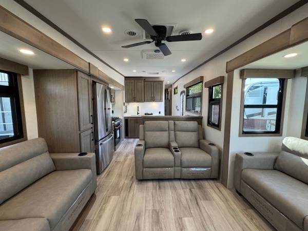 The rear living area will be the talk of the campground. A 65" Smart LED TV, 48" electric fireplace, and theater seating with USB ports create the perfect entertainment space. Dual opposing hide-a-bed sofas provide extra sleeping capacity and an open, spacious layout. Whether you’re enjoying family movie night or hosting friends, this rear living setup delivers unmatched comfort.