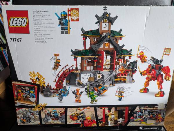 Lego Ninjago retired Lego set. "https://www.lego.com/en-us/product/ninja-dojo-temple-71767" 1394 pieces. "https://www.ebay.com/itm/127544788189" Asking price on eBay to compare Slight dents of...