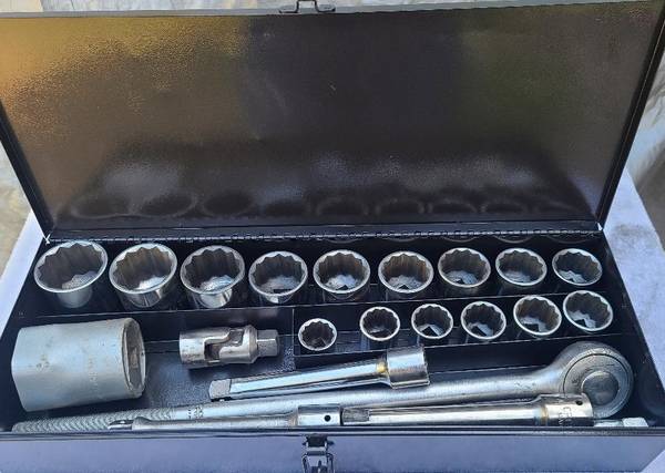 Vintage 18 Pc 3/4" 12pt crescent tool Jamestown sockets w/ breaker bar, ratchet. Also extra swivel 3/4, extra socket 2 1/2 and extra 2 extensions. Please call Steve anytime before 4pm if interested at show contact info